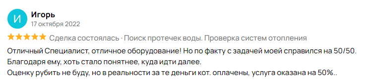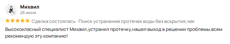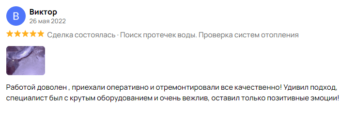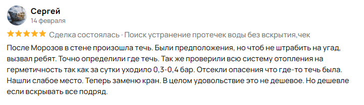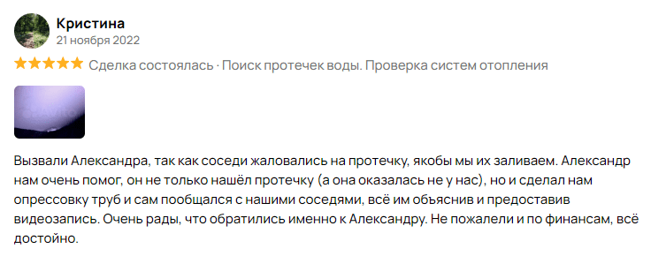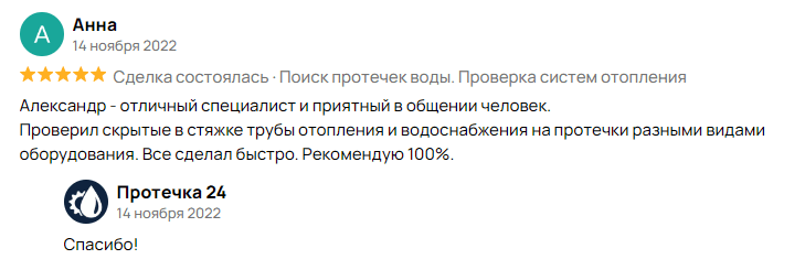 Минимальная стоимость поиска и устранения протечки в квартире от 4 000 руб., в коттедже от 8 000 руб., в здание от 12 000 руб. Точную стоимость определяет мастер на месте после проведения осмотра и диагностики. Именно поэтому выезд мастера бесплатный.